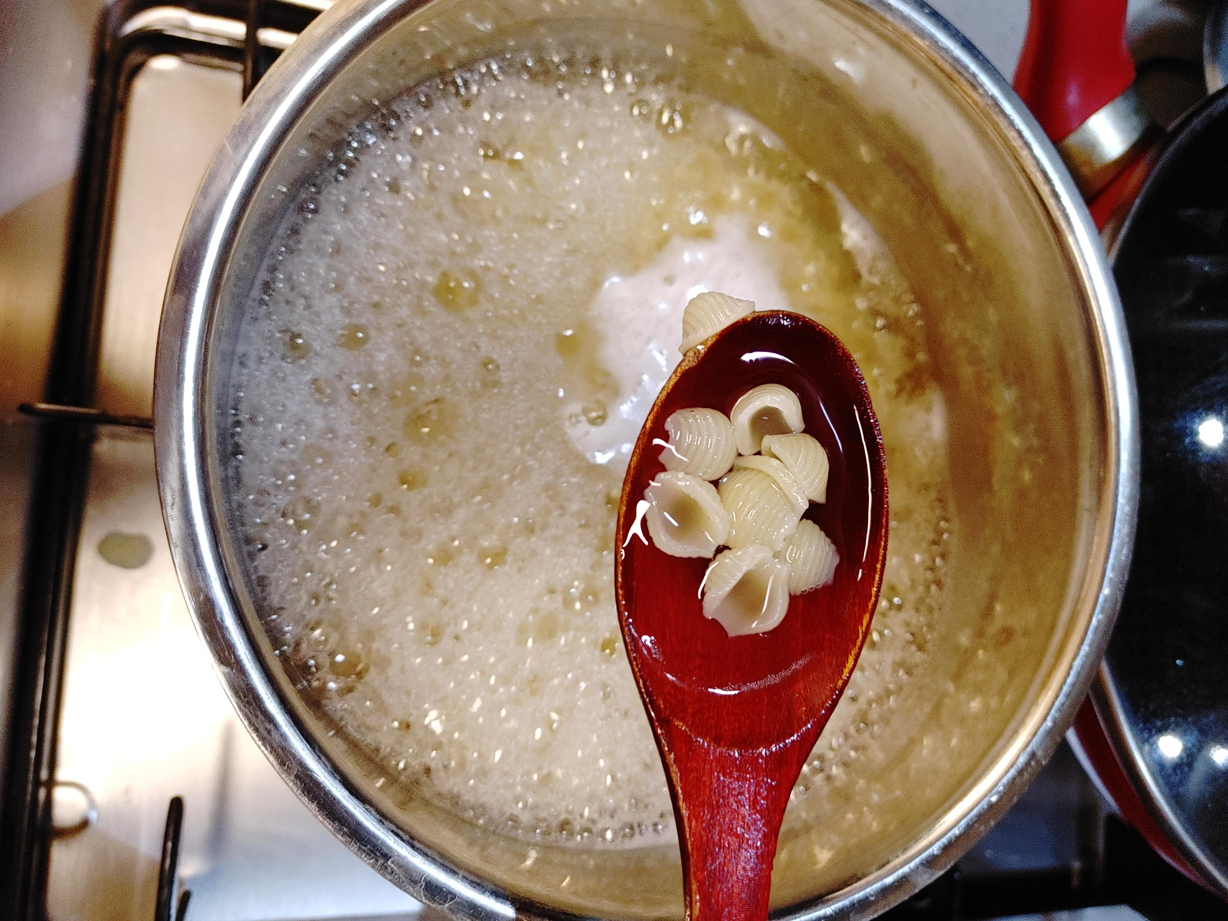 냄비에 물을 끓이고 마카로니를 삶는다.